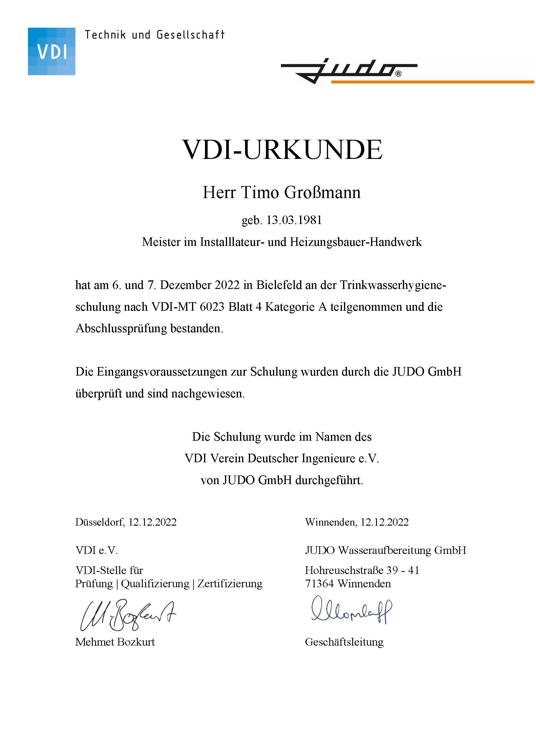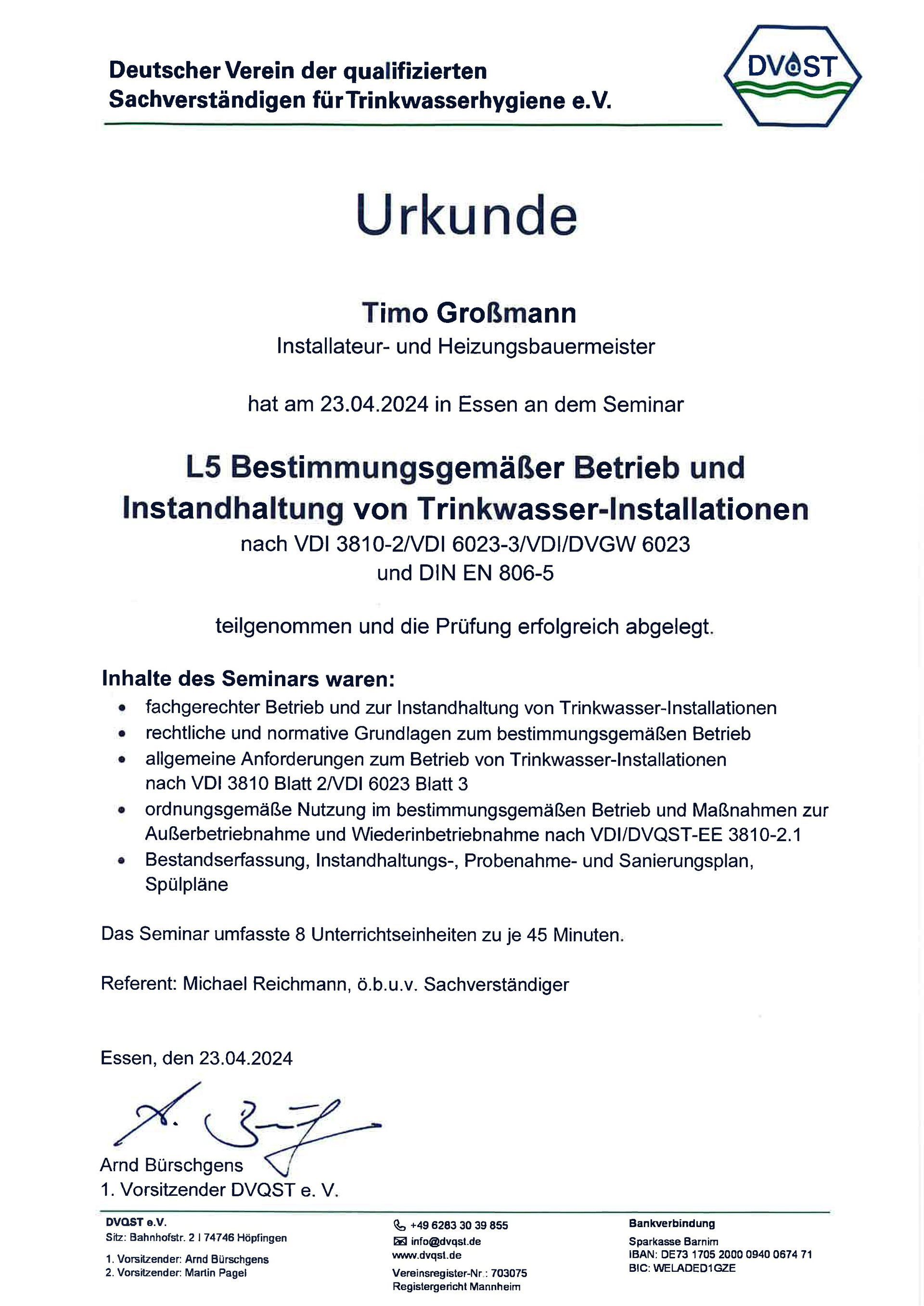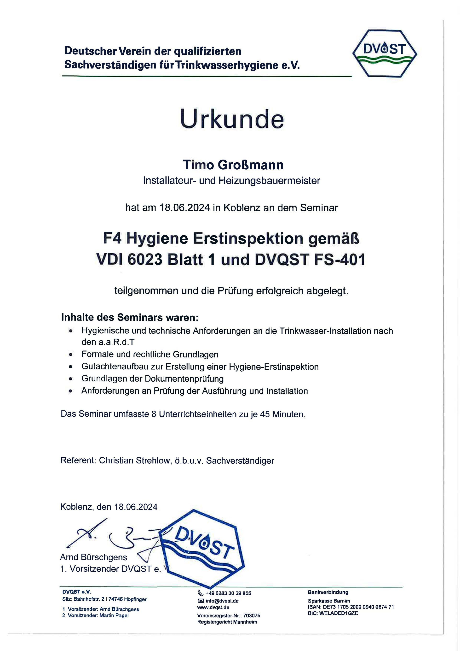 - Seminar-Zertifikat "Gefährdungsanalyse in Trinkwasser-Installation" (06/2023)